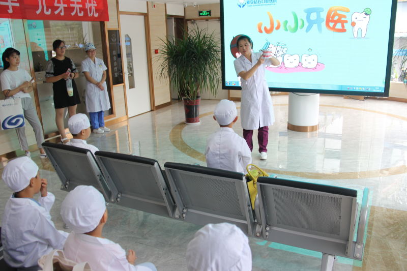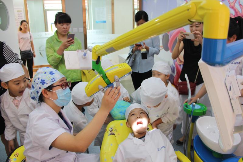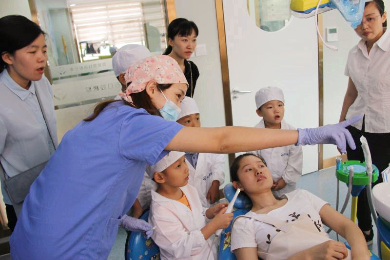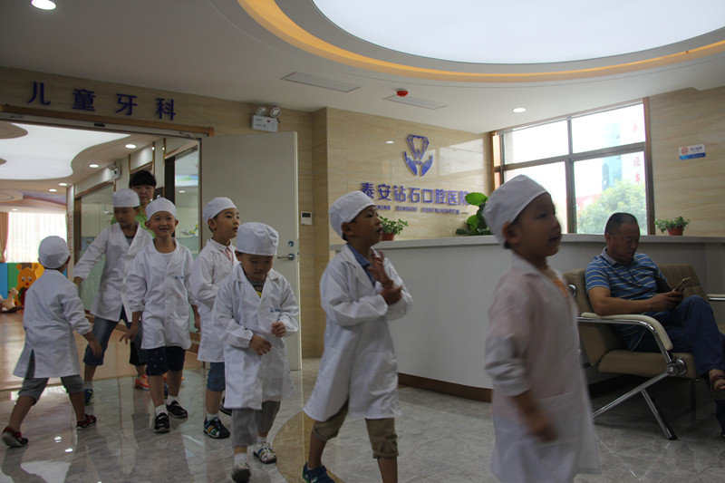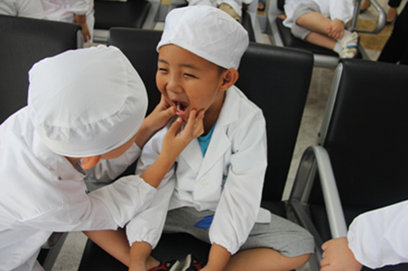 小小牙医互相查看对方有多少颗牙齿,瞧,多仔细! 小小牙医排队进入诊室行医啦! 医护人员先给小牙医检查一下口腔
