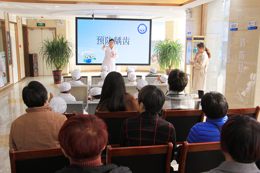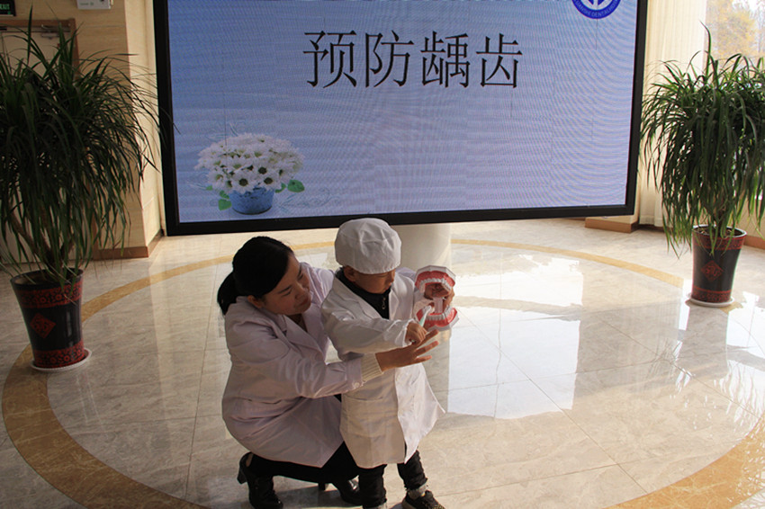 专业医生在给小朋友和家长讲解龋齿的预防及牙齿的结构,让孩子和家长充分了解龋齿对孩子牙齿的影响。
