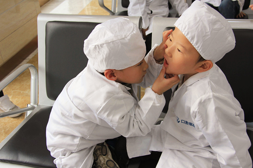 两个小朋友互相查看对方有几颗牙齿,增强孩子对牙齿结构了解,提高孩子的观察能力和认真程度。