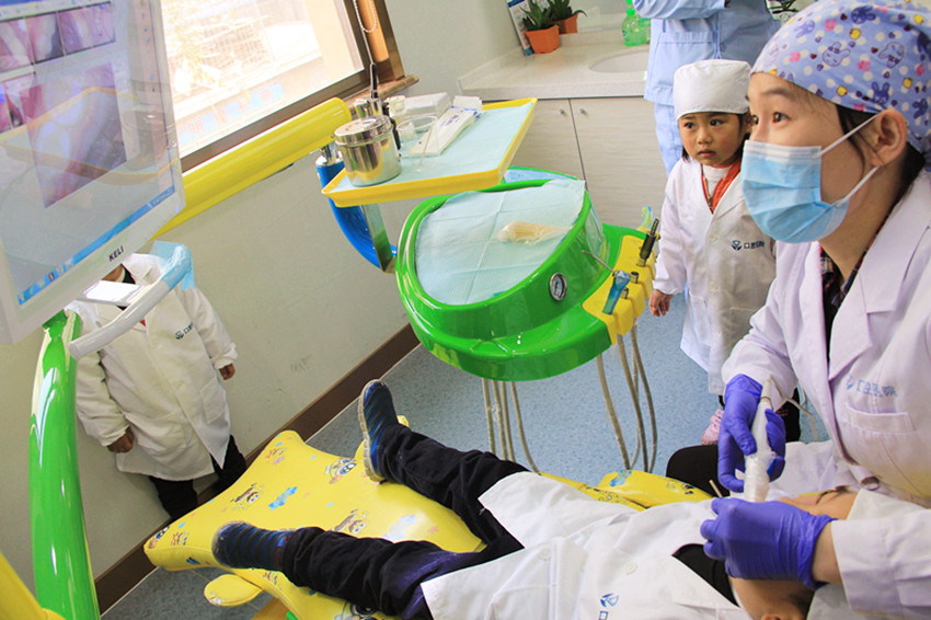 11月7日上午九点,参加泰山口腔医院“小小牙医体验活动”的爱民幼儿园的家长孩子和老师陆续到场,展开儿童口腔健康知识基础趣味讲座,现场气氛相当活跃。儿童口腔基础趣味讲座结束之后,医生带领小朋友参观医院专业设备。过程中医生给小朋友们讲解了设备的功能,小朋友还可以现场体验,从而消除了小朋友们心里对仪器的恐惧感。紧接着,现场将小朋友们分组,然后换上医生服装,轮流进行角色互换,扮演“小小牙医”,由专业牙医医生协作小牙医为自己的爸爸或妈妈进行一对一口腔检查,让小朋友感受当牙医的魅力,进行亲子互动。