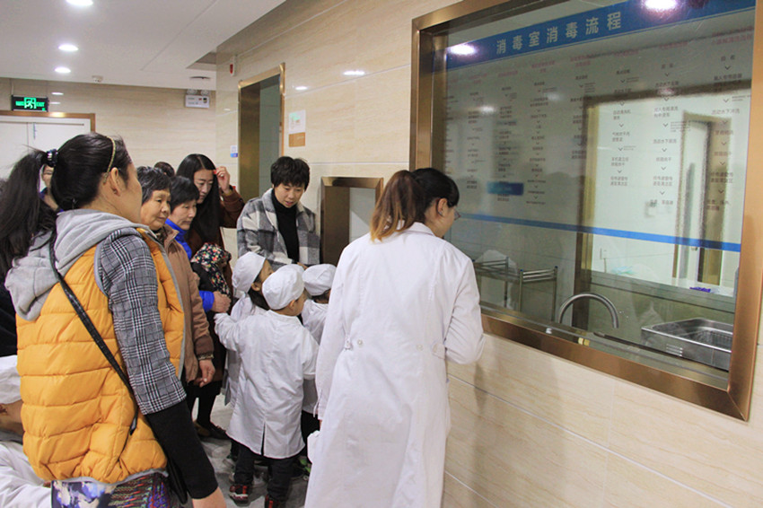 医生带领小朋友参观医院的消毒室,孩子惊讶地说:“哇塞,设备好先进,好卫生”。
