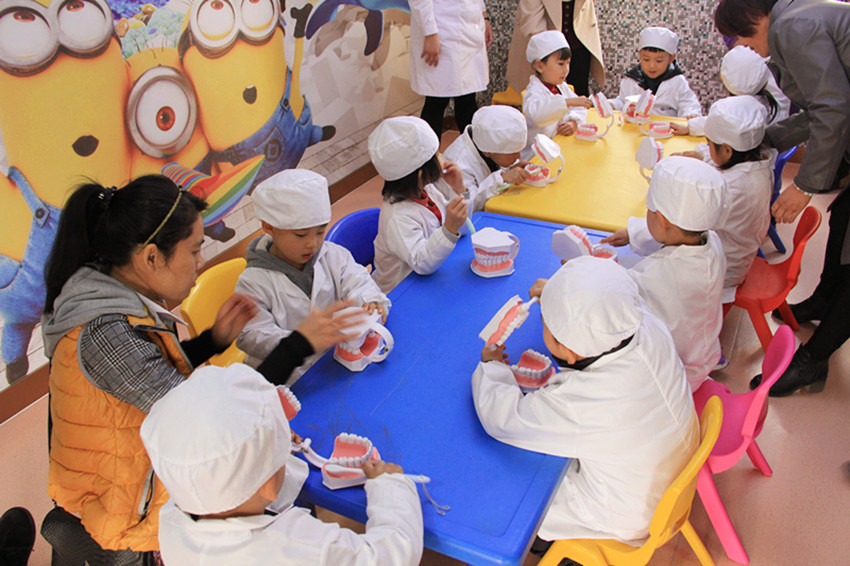 小牙医行医完成之后,小朋友在体验区对刚才讲解的正确刷牙方法进行巩固练习,以便对牙齿好好保护。