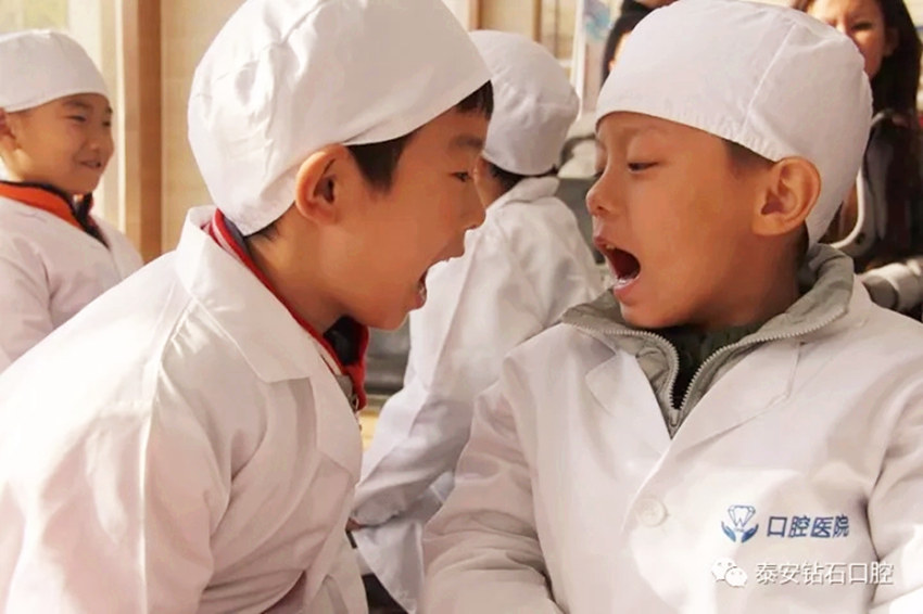 医生让小朋友互相查看对方牙齿有几颗,互相检查,配合默契