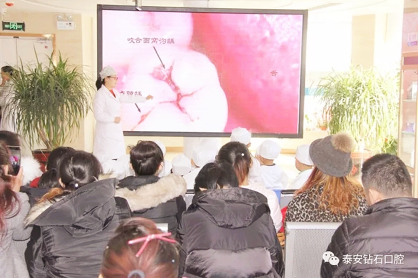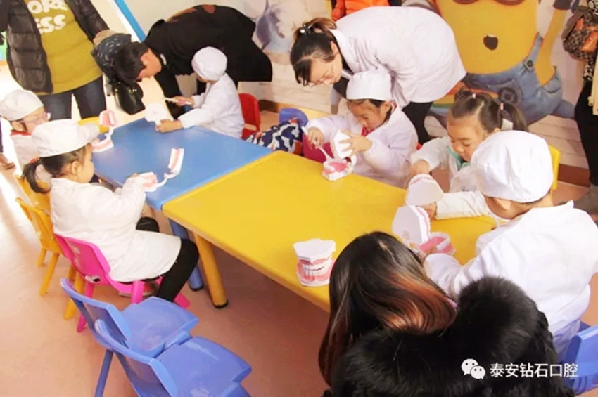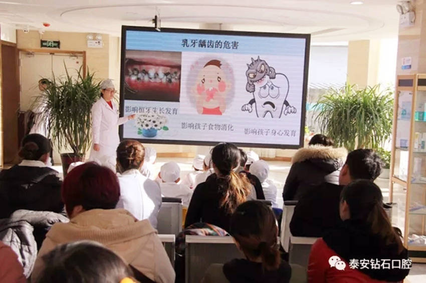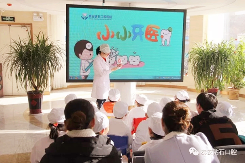 首先,泰山口腔医院医生通过生动活泼的关于牙齿方面的动画片和幻灯片,用寓教于乐的方式位小朋友讲解口腔健康知识,包括龋齿的发展过程,如何正确刷牙,如何预防龋齿等。