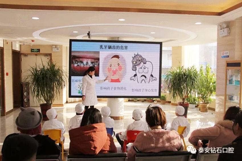 医生进行口腔保健知识宣教,看着大屏幕上的幻灯片,小朋友很快进入了状态,跟着医生一起了解牙齿保健知识。