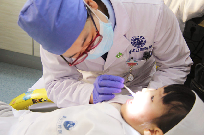 医生正在检查小朋友口内有没有“虫牙”,口腔卫生干净与否,并且将口腔问题记录在档案上。
