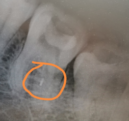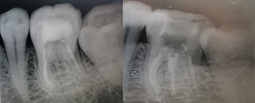 X线检查:(牙合)面高密度影近近中髓角,牙根完整,未见根内、根外吸收