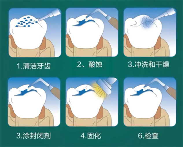 首先医生对儿童的牙齿的牙面进行清洁、酸蚀、冲洗,用流动的窝沟封闭材料涂在牙齿上,让它渗入到牙齿的窝沟内,然后经光照后固化,最后检查调颌,对封闭剂进行调磨,去除咬合高点。这样完成以后,牙齿不再容易遭受细菌入侵。