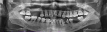 牙周炎患者X光片,全口牙齿出现2~3度的松动,无法咀嚼。
