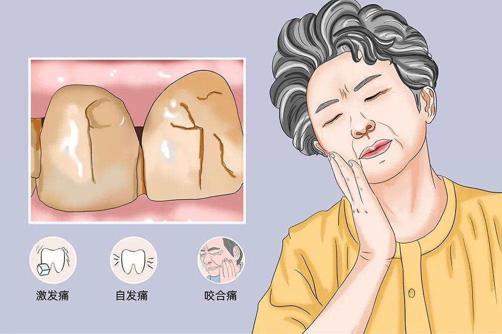 当裂纹位于牙齿浅层时,会偶尔出现冷热敏感;当裂纹较深时,除对冷热刺激敏感外,在咬合硬物时可能会引发疼痛;若裂纹加深波及牙本质牙髓时,多有慢性牙髓炎症状或者出现定点性咀嚼剧痛。
