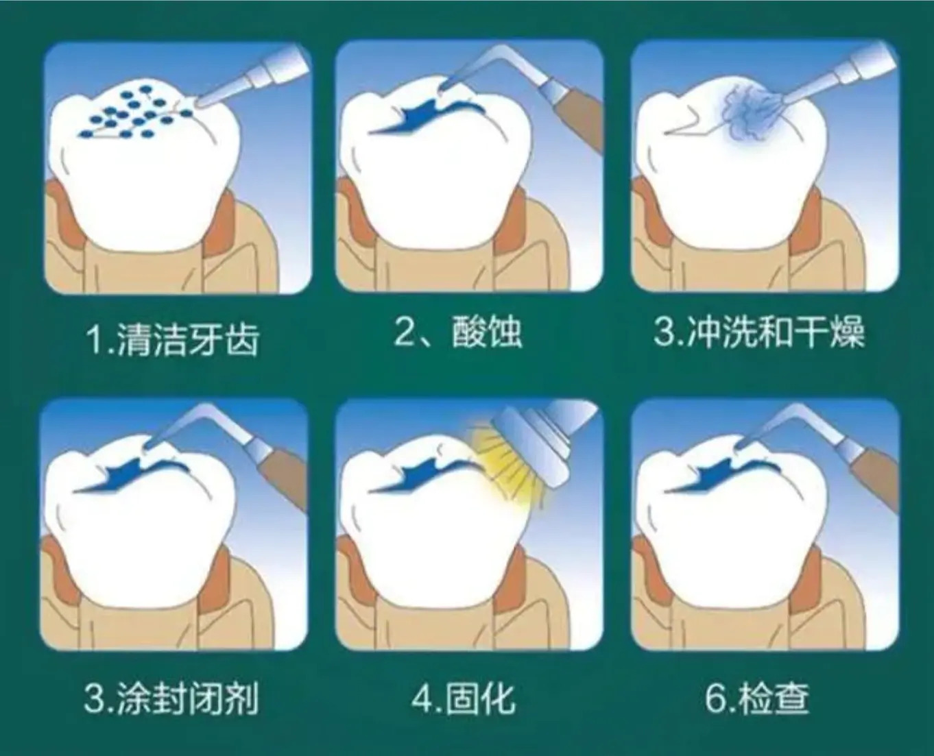 窝沟封闭包含这些步骤:用软牙刷把牙面清洗干净,在牙面上涂布酸蚀剂,使窝沟表面呈微小细孔,以便封闭剂向窝沟内渗入,达到封闭作用,然后彻底吹干,以免影响树脂的固化和与牙表面的粘接强度。最后在窝沟表面涂抹封闭剂后,用医用灯在口腔内照10-20秒。
