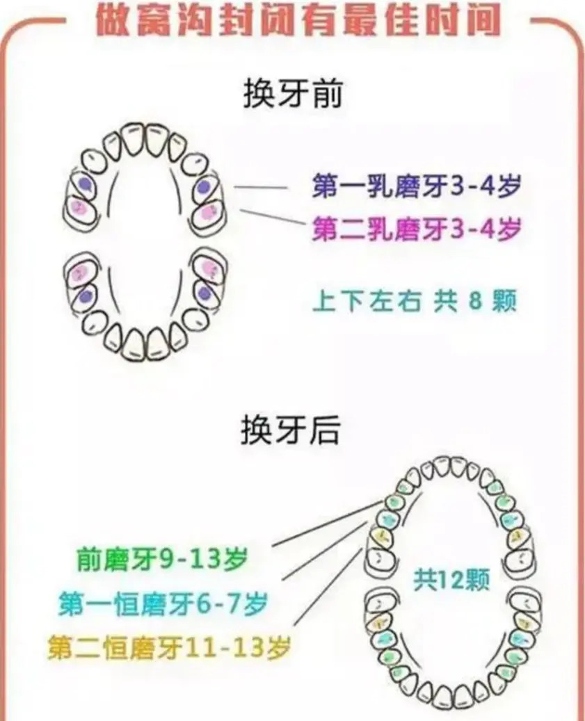 只要有窝沟裂隙比较深的牙齿,都可以做窝沟封闭,而窝沟裂隙深的牙齿通常是磨牙。3-4岁孩子乳磨牙萌出、6岁时六龄牙也长出来了、9-13岁其他恒磨牙也陆续萌出,这几个时间段都应及时进行窝沟封闭加以保护。