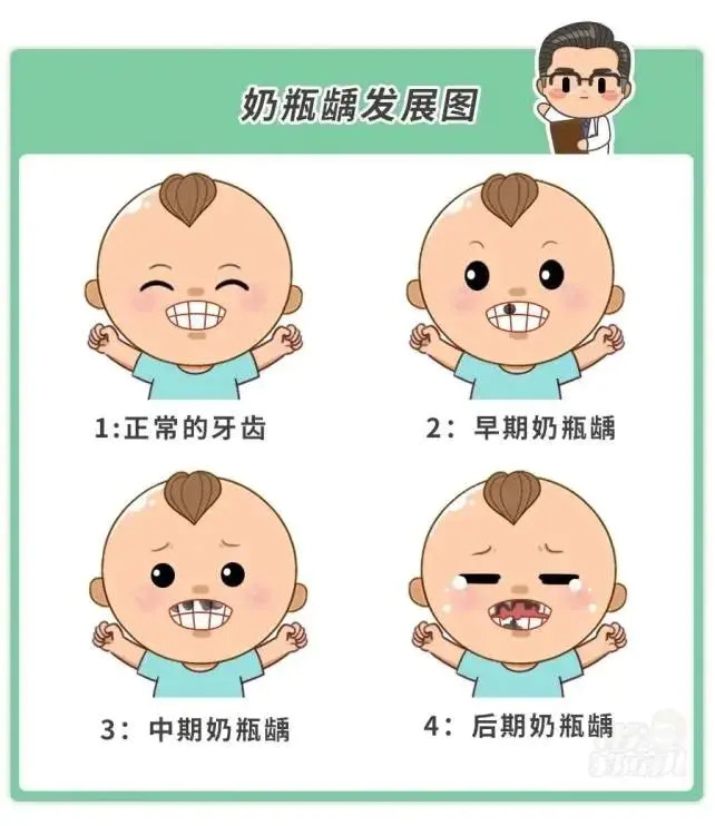 奶瓶龋是一种由婴儿在夜间喝奶、或含着奶嘴睡觉而造成的龋齿,临床上称为奶瓶龋(又称哺乳龋),表现为上颌乳切牙(即门牙)的唇侧面,及邻面的大面积龋坏,牙齿患龋病后不能自愈(即不能再长好)。由于乳牙的钙化程度低,因此患龋后病情进展迅速,破坏面积广,并且治疗效果差。